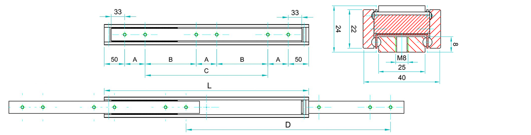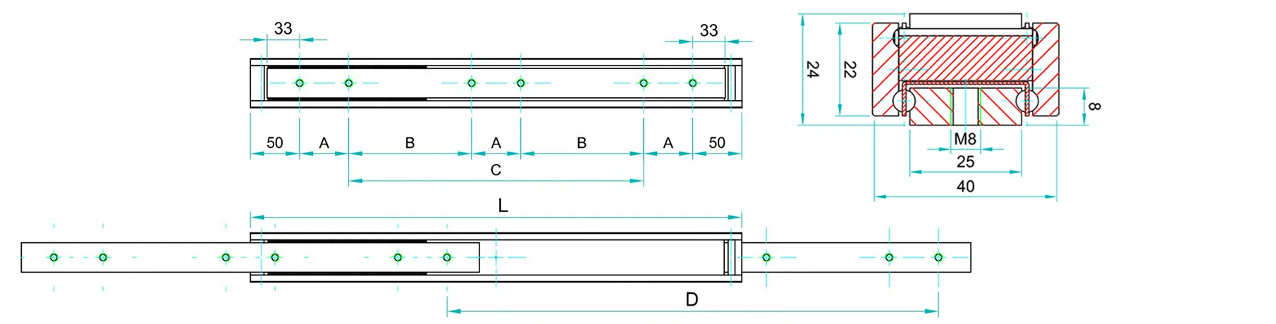 Kızaklar EN 10277’ye göre soğuk çekilmiş C45E+C çeliğinden imal edilmiştir. Standart bilya kafesleri çinko kaplı sacdan, bilyeler ise DIN 5401’e göre karbon çeliği C85 G100’den imal edilmiştir. Tek bir DTSB-40’ın ağırlığı 5,55’tir. metre başına kg.
