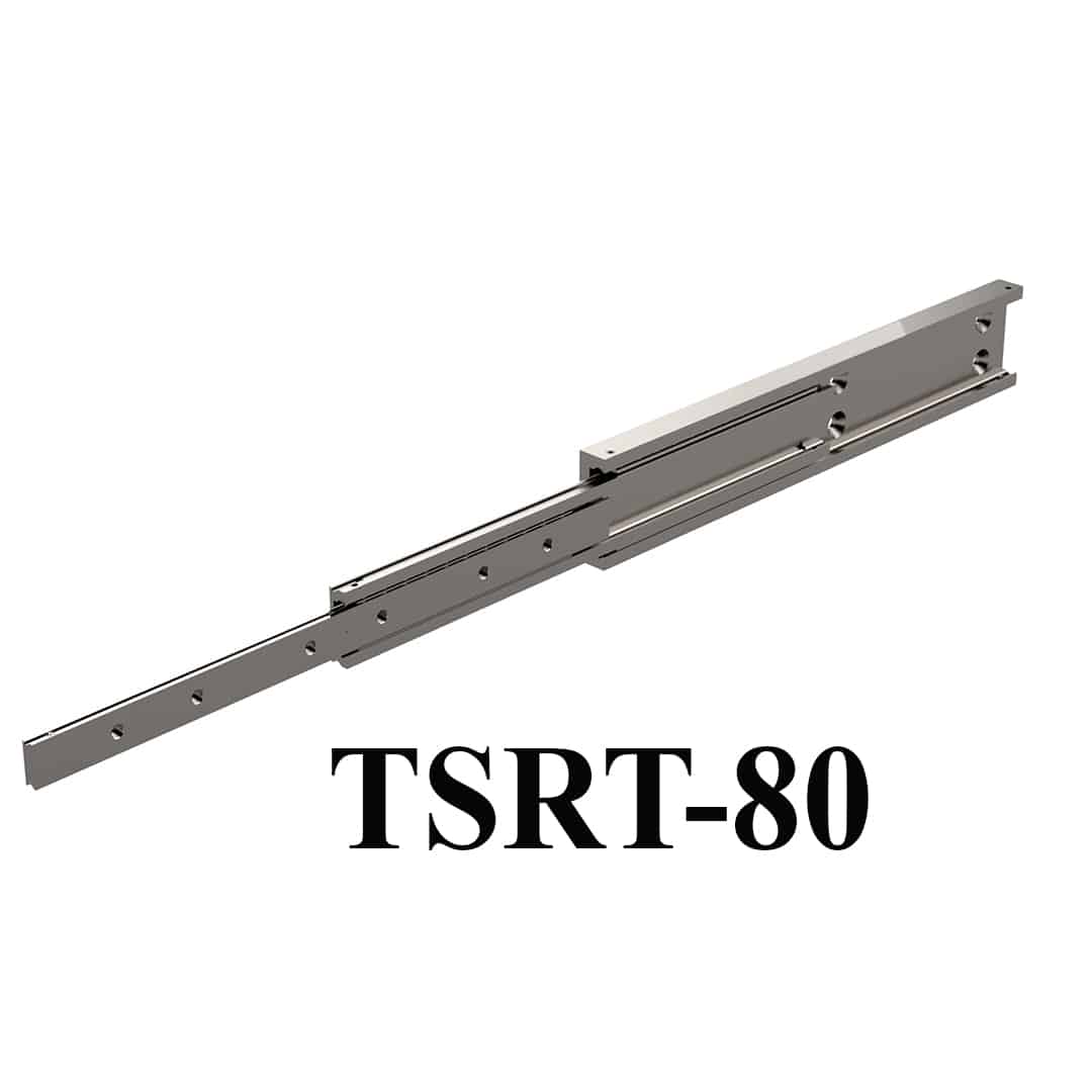 Düzgün çalışma ve doğruluk için 4 nokta temaslı işlenmiş bilye paletleri ile soğuk çekilmiş çelik bölümlerden yapılmıştır ve mükemmel düzeyde şok ve titreşim direncine sahiptir. Buna göre ürün, kapalı konumda istiflendiğinde aşırı yüke maruz kalan uzun veya geniş çekmeceleri desteklemek için çok uygundur. TSRT-80 kızağı yan eksende (düz) de kullanılabilir ancak sapmanın artmasıyla yük kapasitesi yaklaşık %40’a (kızak uzunluğuna bağlı olarak) düşecektir. Tek bir TSRT-80, metre başına 12,46 kg ağırlığındadır.