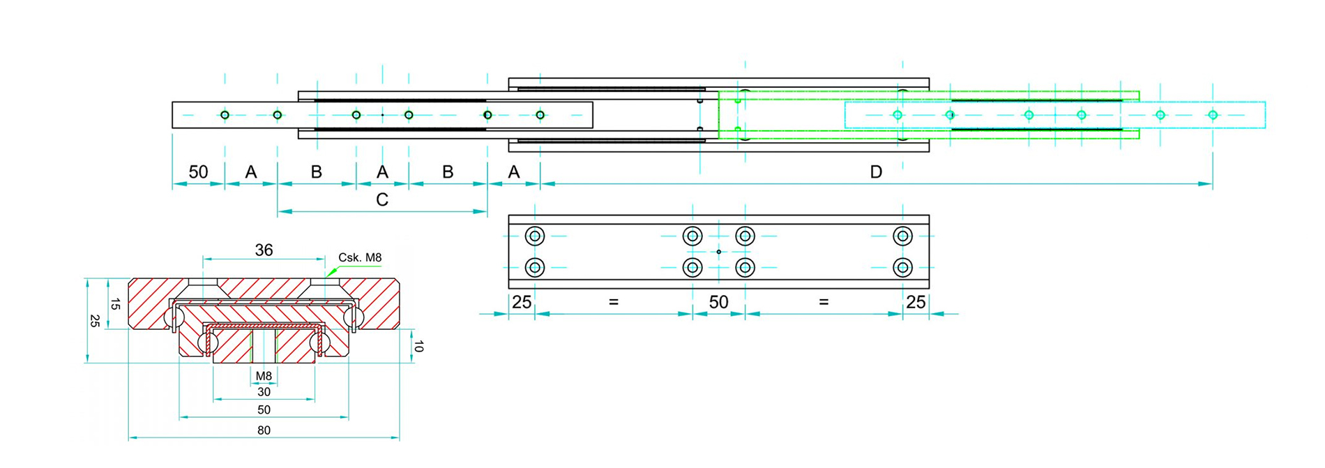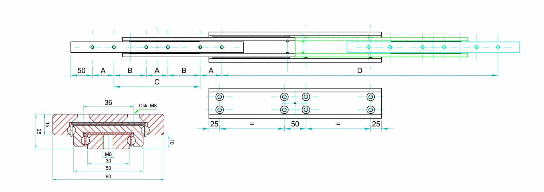 | Montaj Uzunluğu: L | Uzatma Uzunluğu: D | Taşıma Kapasitesi: KG | “A” | “B” | “C” |